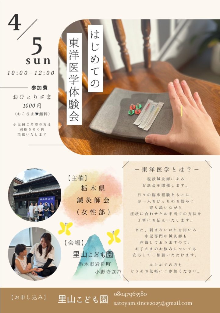 栃木県鍼灸師会女性部主催で、「はじめての東洋医学体験会」を開催します。